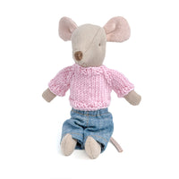 En myk, håndlaget genser i lys rosa, laget til Maileg-mus.